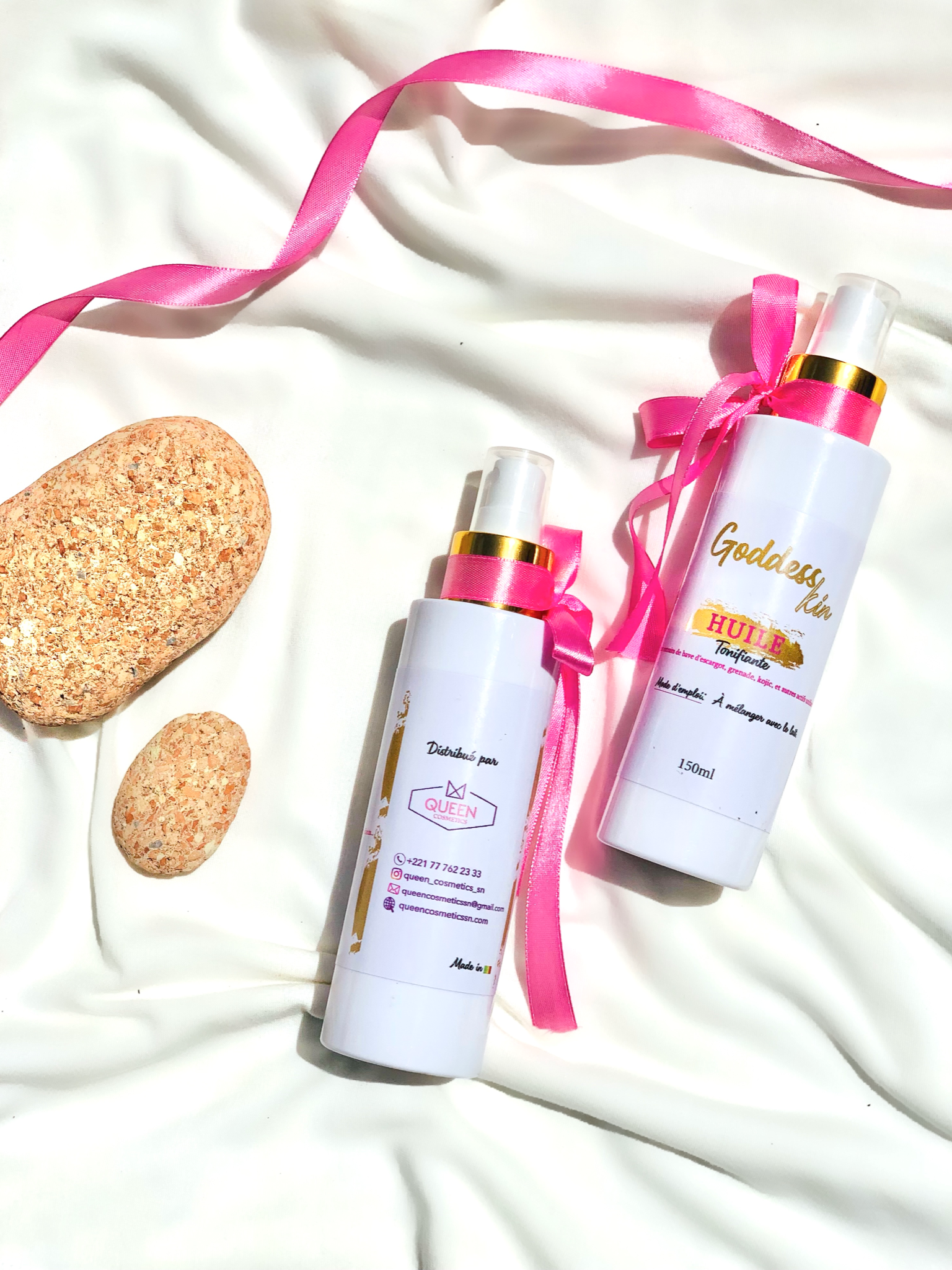 L'huile tonifiante de la gamme GODDESS SKIN accompagne le lait de corps et le rend encore plus éclaircissant. Il est très bénéfique car en plus de vous éclaircir, il améliore l’aspect de la peau, favorise la régénération cellulaire, réduit l'apparence des vergetures, rides, ridules et permet de tonifier le tout pour un effet satiné. Afin de prévenir la sécheresse cutanée, les veines apparentes, causées par le manque d'hydratation, ajoutez le au lait de corps de la même gamme ou utilisez le juste après la douche sur corps mouillé et laissez sécher. Le teint que vous aurez...